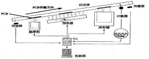下面以雙波峰焊機(jī)的工藝流程為例,來說明波峰焊原理(見圖3-1)