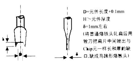(2)用扁鏟形烙鐵頭(可自制或采購,見圖12—1)加熱焊點,將元器件焊端或引腳與焊盤之間的焊料融化,消除虛焊、拉尖、不潤濕等焊點缺陷,使焊點光滑、完整。