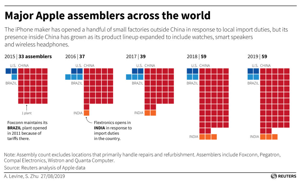 但是在這里產(chǎn)出的蘋果數(shù)量相比全球?qū)μO果的需求而言,只是杯水車薪。路透社 2019 年 8 月經(jīng)過(guò)調(diào)查后發(fā)布的報(bào)告顯示,蘋果在印度和巴西兩國(guó)生產(chǎn)的產(chǎn)品只是用來(lái)滿足當(dāng)?shù)匦枨螅谥袊?guó)增加的蘋果代工廠遠(yuǎn)超過(guò)中國(guó)以外。