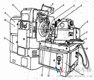 1、水平輪位 2、安裝角 3、分度掛輪 4、垂直輪位 5、床位 6、刀位 7、搖臺(tái)角 8、滾切修正機(jī)構(gòu) 9、進(jìn)給掛輪 10、切速掛輪 11、滾比掛輪 12、刀盤(pán)主軸 13、工件主軸 14、床身 15、床鞍