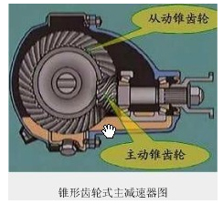 其中錐形齒輪式主減速器如圖所示,廣泛的應(yīng)用于后驅(qū)汽車的后橋中.變速器輸出動力經(jīng)過傳動軸傳給主動錐齒輪,經(jīng)從動錐齒輪減速后傳給差速器。