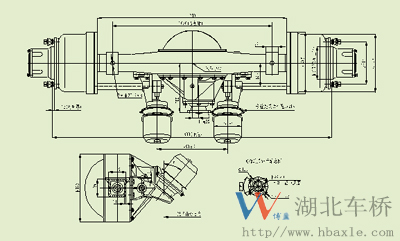 2402K14-010-4.1主減速器總成主減速器總成噪音低,傳遞扭矩大。其突緣端面至橋殼中心線距離為300mm(見(jiàn)如下安裝尺寸圖)。主從動(dòng)錐齒輪有噪音低、壽命長(zhǎng)的特點(diǎn),其傳遞扭矩16500N.M,裝配成總成后噪音在84dB以下,壽命可達(dá)70萬(wàn)次以上。