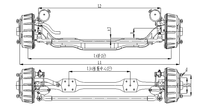 1.前軸為整體鍛造結(jié)構(gòu),采用加強(qiáng)設(shè)計(jì),承載能力強(qiáng); 2.車輪輪輞定位方式可采用球面定位或止口定位;3.輪距、板簧距可靈活調(diào)整;